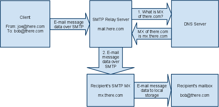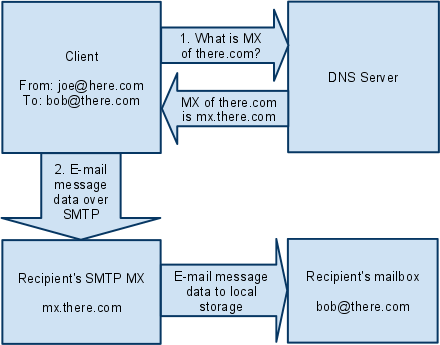 Typically, the client sends e-mail through an SMTP relay server. An relay server is a hub which accepts e-mails from clients and relays them to SMTP servers of their intended recipients. These SMTP servers as called MX servers (Mail eXchange). To find out which MX server exchanges e-mail for a particular domain, the relay server makes DNS MX lookup query for that domain.
